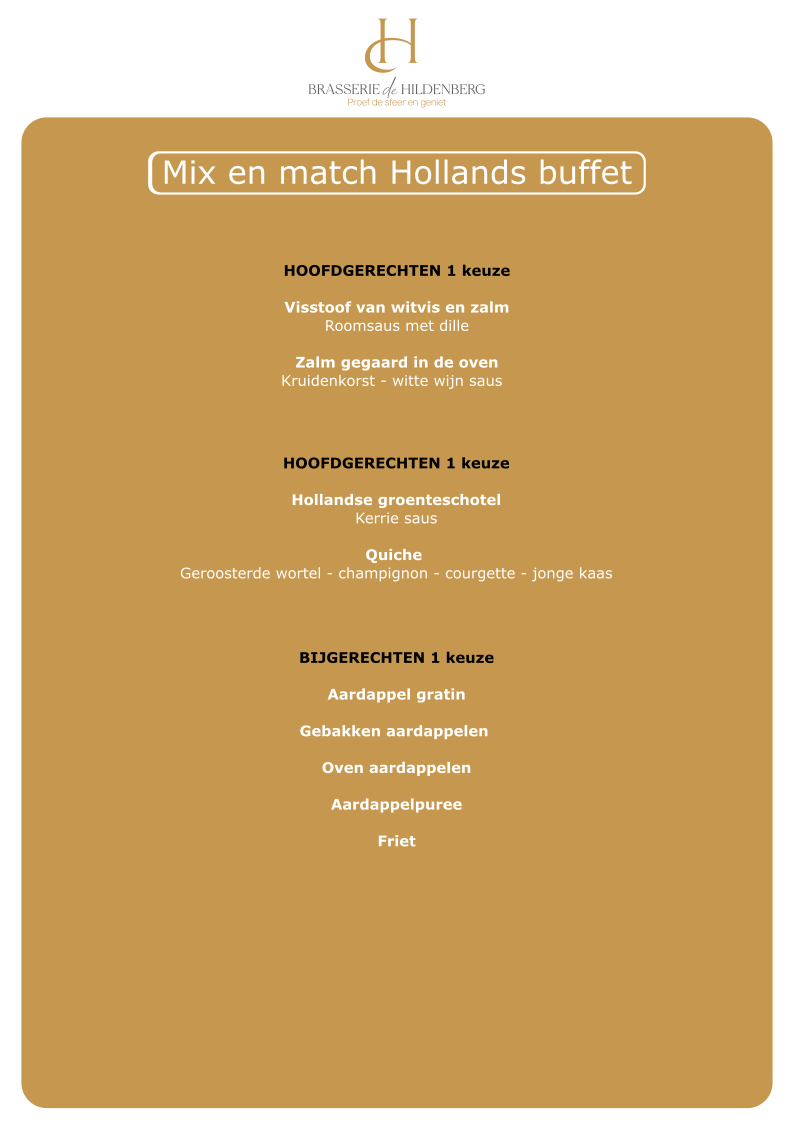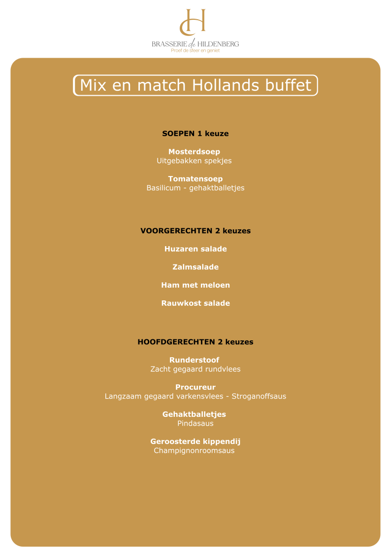 U kunt zelf de buffetten a €32,50 p.p samenstellen waarbij er in onderstaand overzicht is aangegeven waaruit gekozen kan worden. U kiest hierbij uit een soep, twee salades, twee warme vleesgerechten, 1 visgerecht, een vegetarisch gerecht en een groente en aardappelgarnituur. Uiteraard zijn uitbreidingen/wijzigingen in de buffetten mogelijk, hiervoor stellen wij graag een offerte op maat voor u samen.