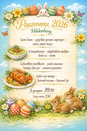 Vier Pasen in stijl bij ons op De Hildenberg! Op Eerste Paasdag verwelkomen we je graag voor een heerlijk diner of kies iets van de diner kaart.
