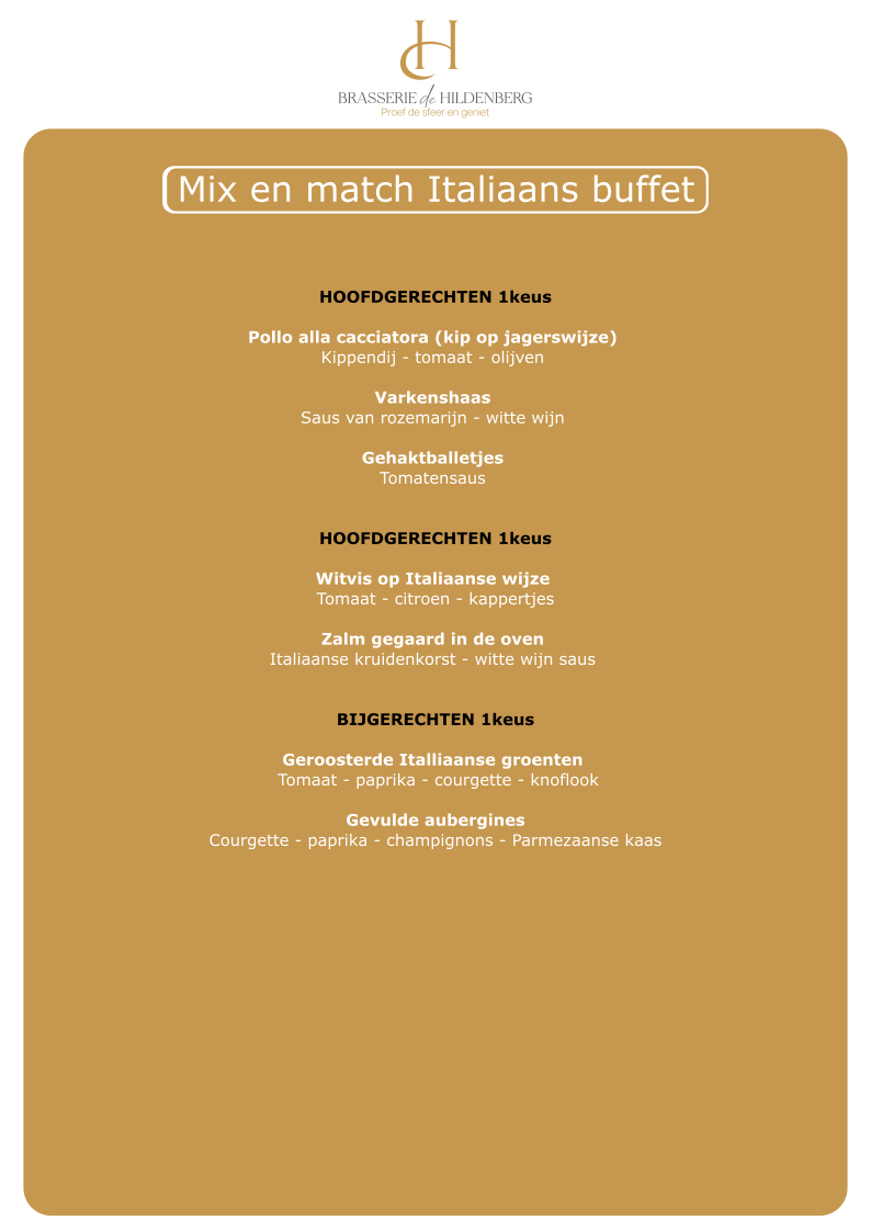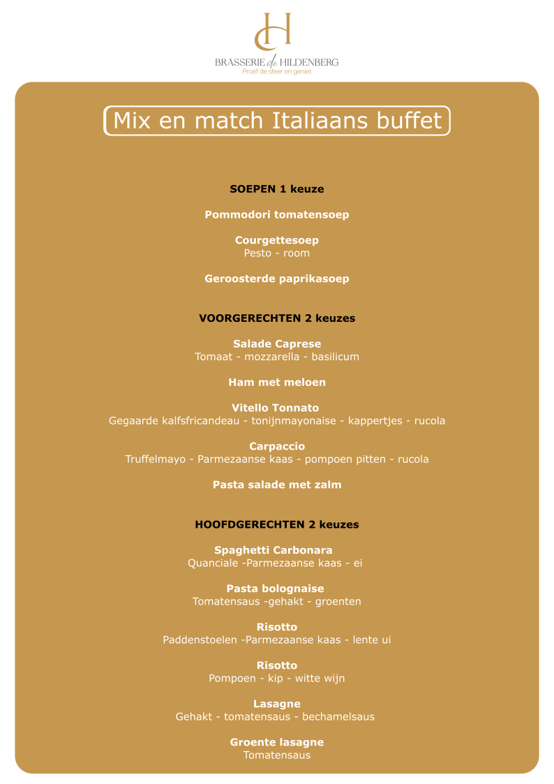 U kunt zelf de buffetten a €32,50 p.p samenstellen waarbij er in onderstaand overzicht is aangegeven waaruit gekozen kan worden. U kiest hierbij uit een soep, twee voorgerechten, twee warme pastagerechten, een vleesgerecht, een visgerecht, een vegetarisch gerecht en een bijgerecht.
