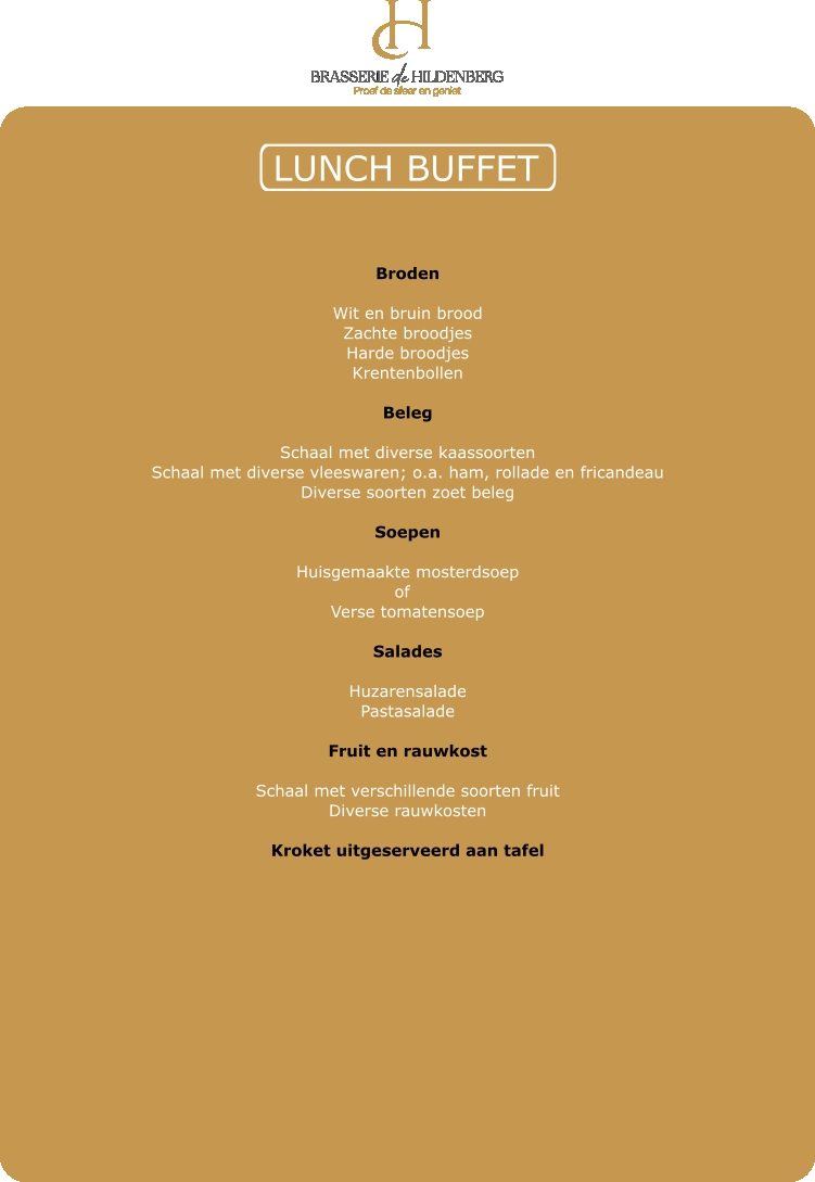 Geniet gedurende twee uur van ons uitgebreide lunchbuffet. U kunt het lunchbuffet uitbreiden met karaffen jus, melk en karnemelk a €5,50 p.p.